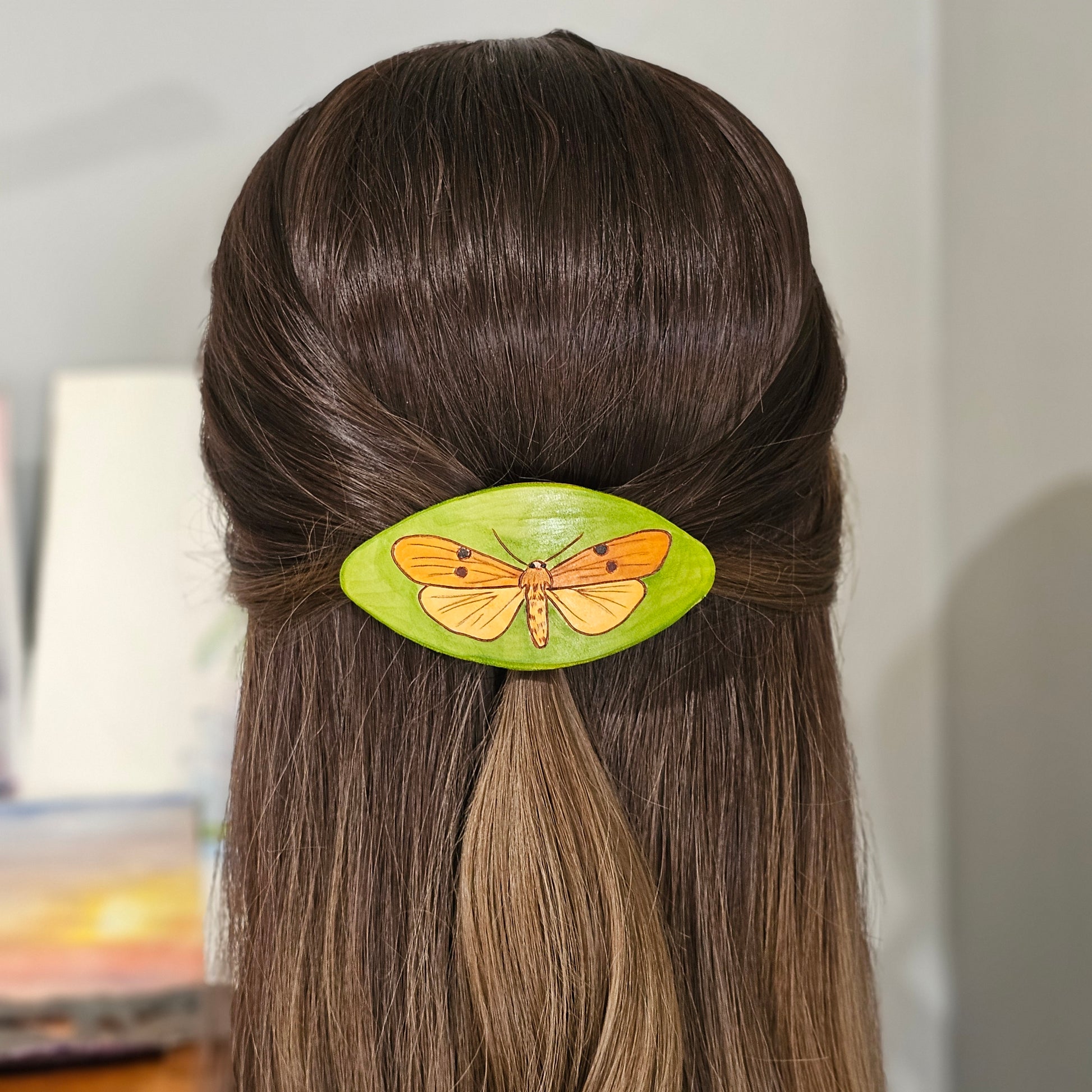 A one of a kind wearable piece or art! "4 Spotted Footman Moth" is original art work by me, burned by hand onto the Leather with leather dyes used to add the color. No lasers! Signed by the Artist, it's sure to look stunning! How you wear it is entirely up to you, the possibilities are endless!