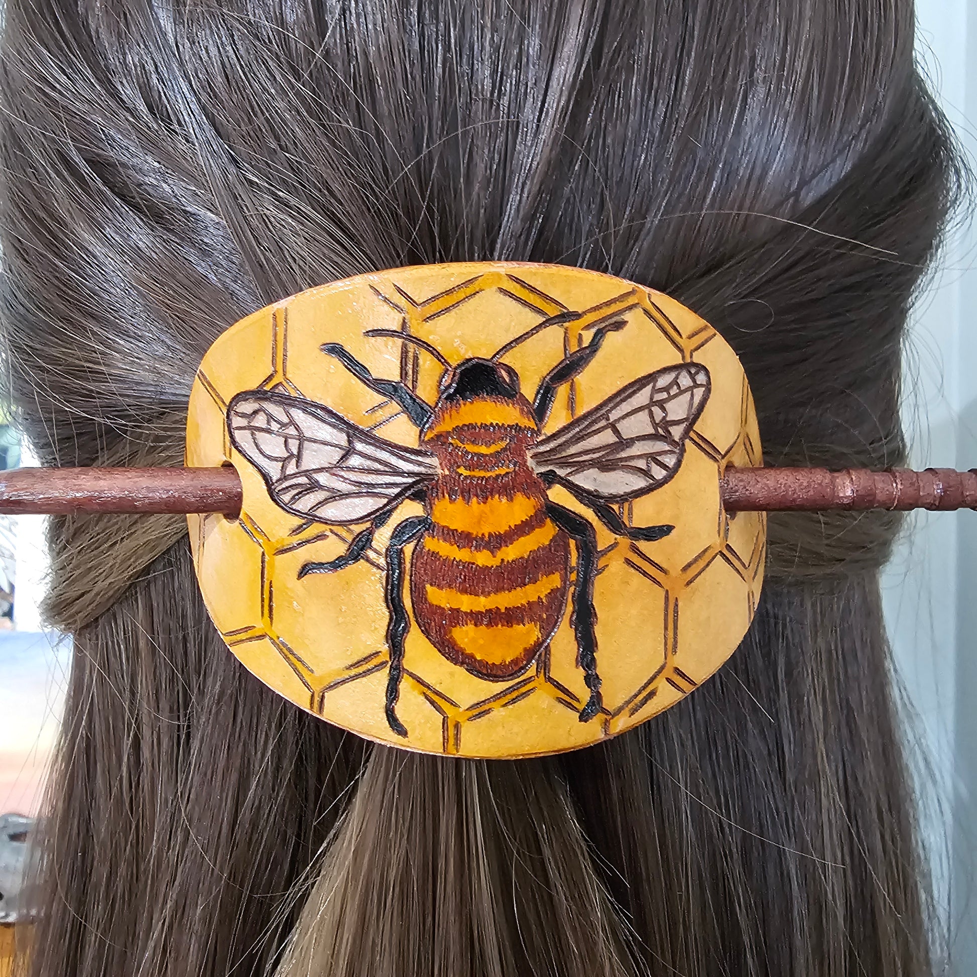 Original art work, burned by hand on Leather and enhanced with leather dyes and a bit of background tooling. No lasers! All my barrettes are sure to look stunning pulling up half the hair and even large enough to hold a full bun dependent on the length and thickness of the hair, the possibilities are endless!