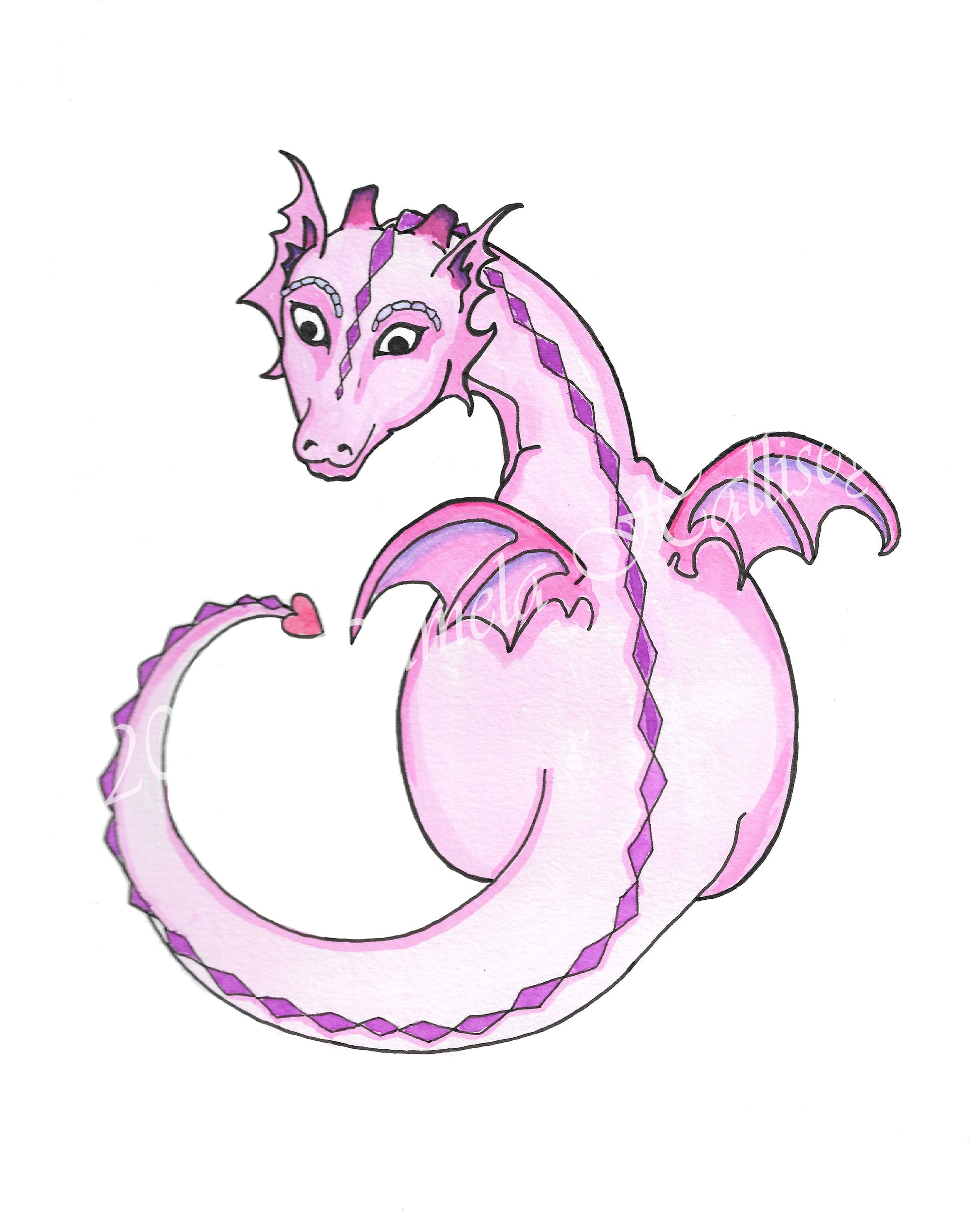 Inspired by a very special little girl.  Cici the baby dragon looks over her shoulder at you while her tail expresses her feelings.  The original Cici is bright pink watercolor with a black ink outline.  I am willing to recreate Cici in other colors by request!  Reach out to us directly for more information on how this adorable baby dragon can be customized.