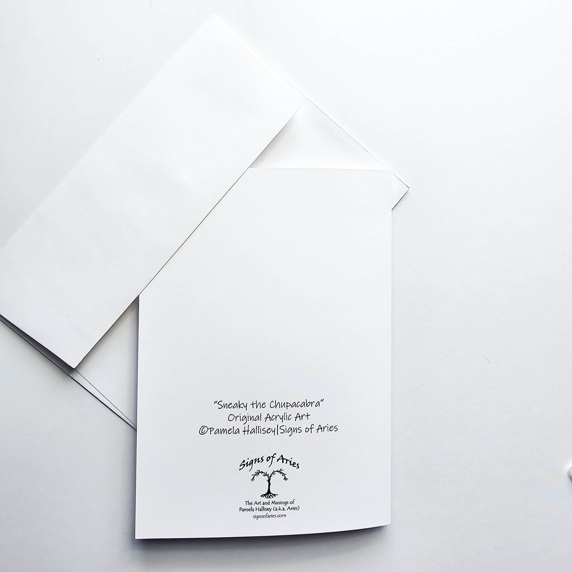 Share your love of Cryptids with all your friends! These Cards are 5" x 7", printed on quality card stock paper, are ready to be framed or sent to friends and family.  All cards come pre-folded with matching envelopes and are blank on the inside so you can write your own greeting!