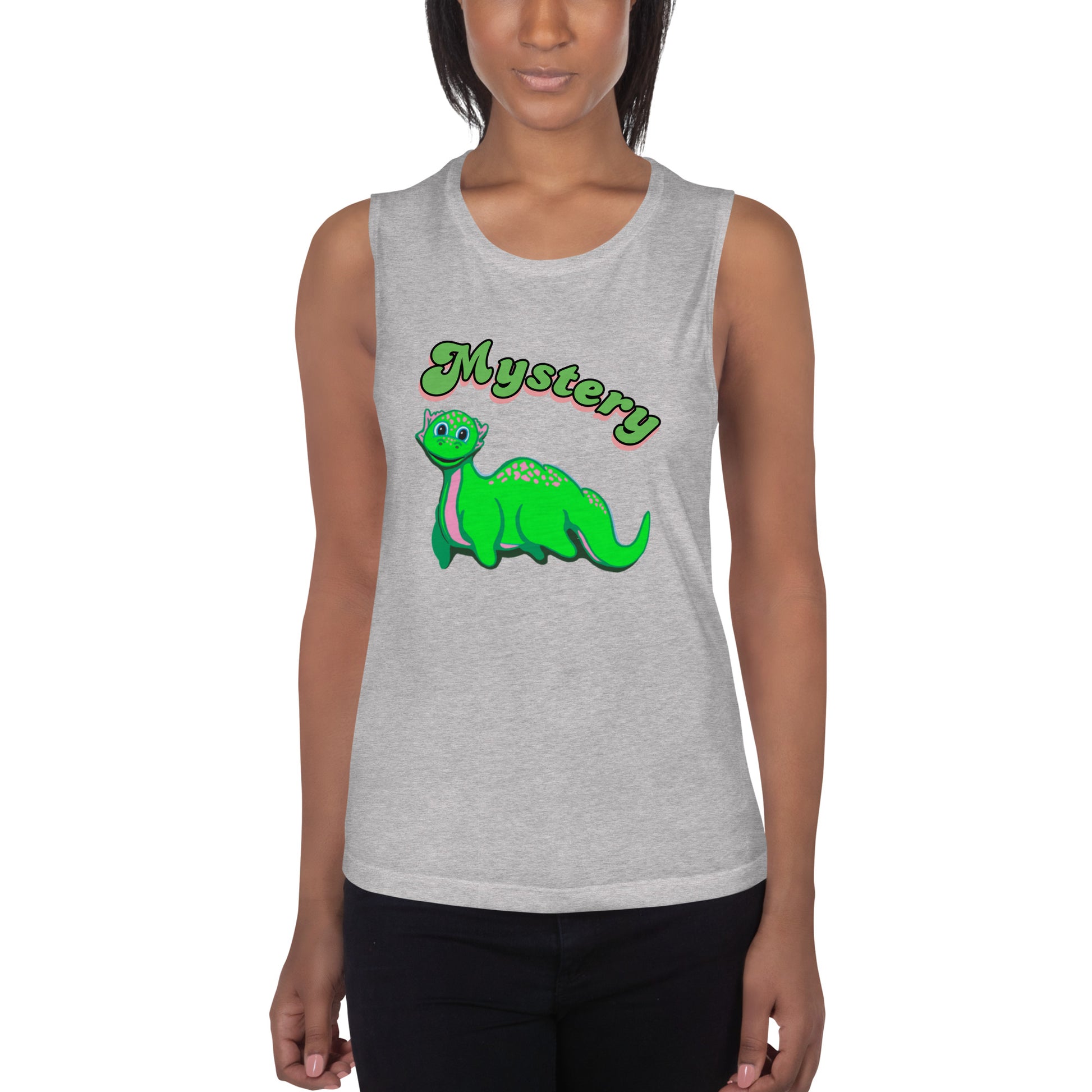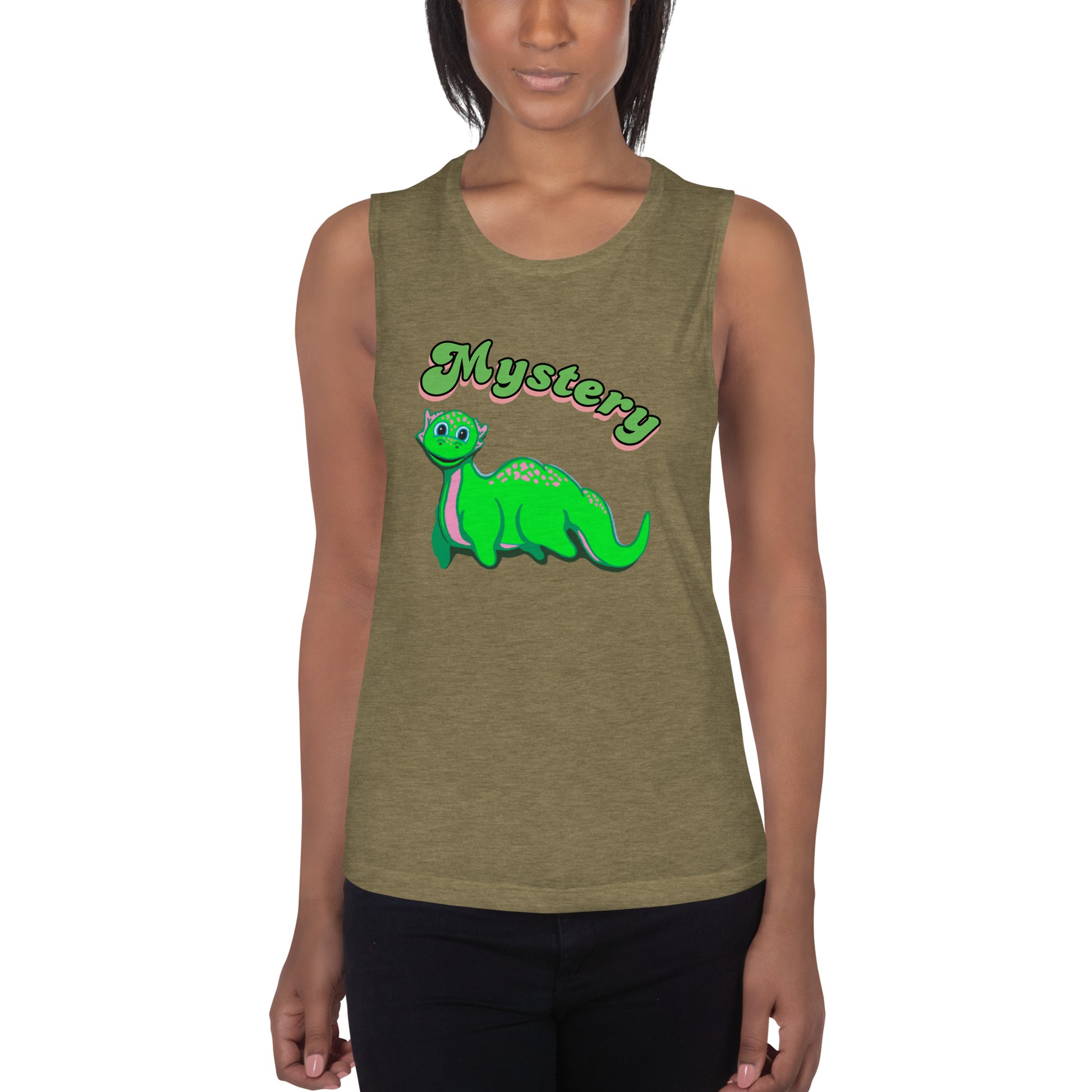 Featuring Mystery the Loch Ness Monster this comfortable muscle tank is lightweight, soft and flowy with low cut armholes for a relaxed look. Perfect for wearing over a sports bra on a hot day or while working out. NOTE: These tanks do run small, I would suggest ordering 1 size larger than you would normally wear.
