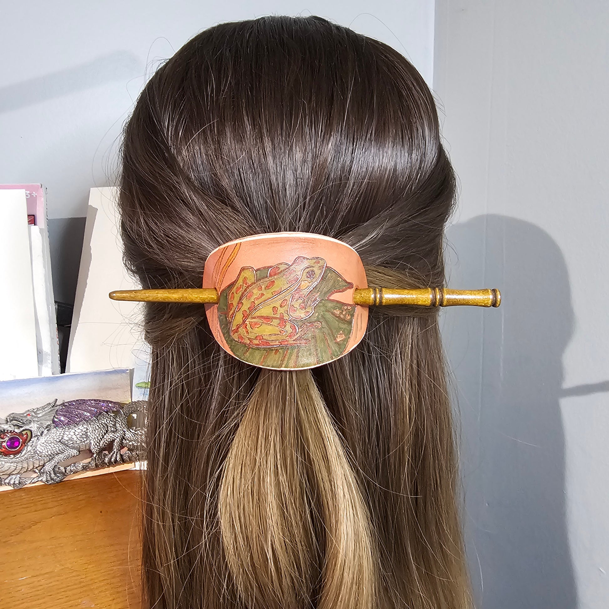 Original art work, burned by hand on Leather and enhanced with leather dyes and a bit of background tooling. No lasers! All my barrettes are sure to look stunning pulling up half the hair and even large enough to hold a full bun dependent on the length and thickness of the hair, the possibilities are endless!