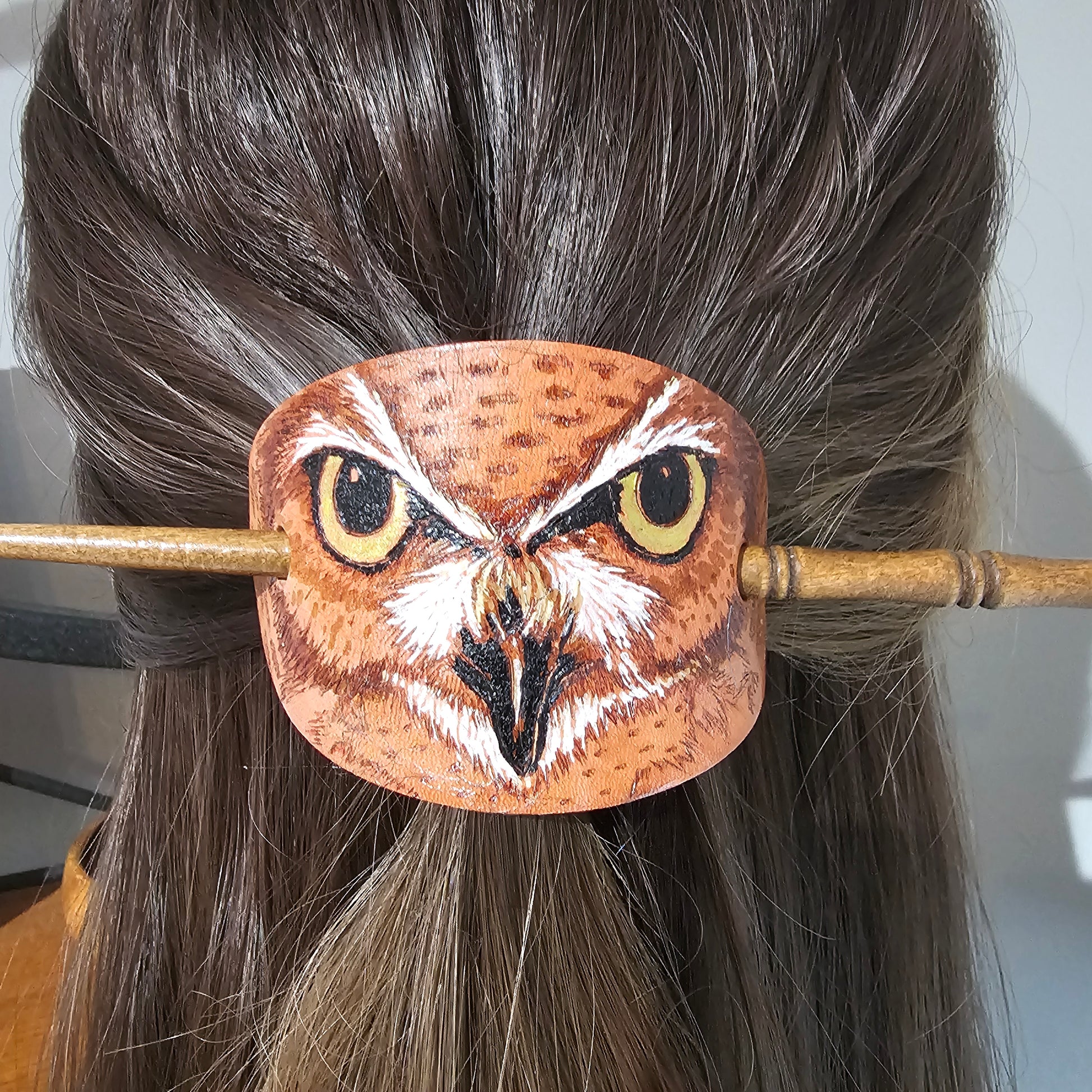Original art work, burned by hand on Leather and enhanced with leather dyes and a bit of background tooling. No lasers! All my barrettes are sure to look stunning pulling up half the hair and even large enough to hold a full bun dependent on the length and thickness of the hair, the possibilities are endless!