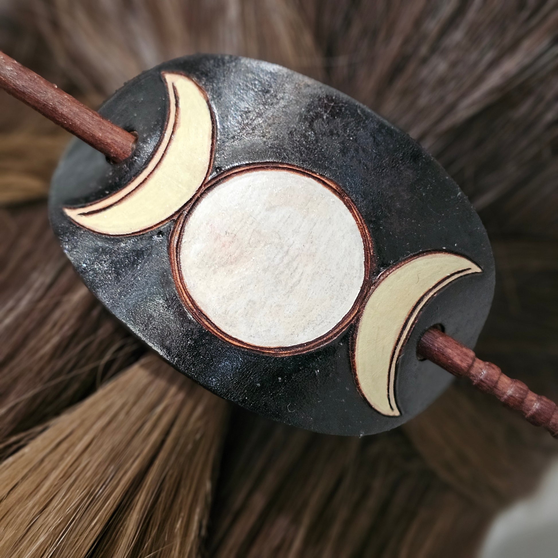 Original art work, burned by hand on Leather and enhanced with leather dyes and a bit of background tooling. No lasers! All my barrettes are sure to look stunning pulling up half the hair and even large enough to hold a full bun dependent on the length and thickness of the hair, the possibilities are endless!